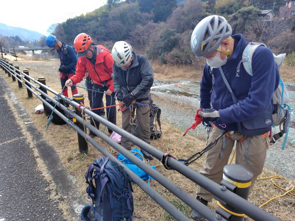 皆様、2日間の研修会新年会無事終了しました。 研修では懸垂下降、引き上げ、少ない装備での救助、ショートロープ、テレインビレーなどを各自の経験なども披露しながら研鑽しました。新年会は十二分に親交を深めました。翌日は快晴のもと蝋梅と早咲き桜を観賞しました。